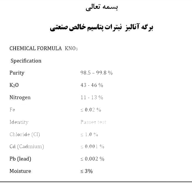 نیترات پتاسیم تولید صنایع ایران شیمی با درصد خلوص بالای 98.9 درصد برای مصارف کشاورزی و صنعتی عرضه می شود .