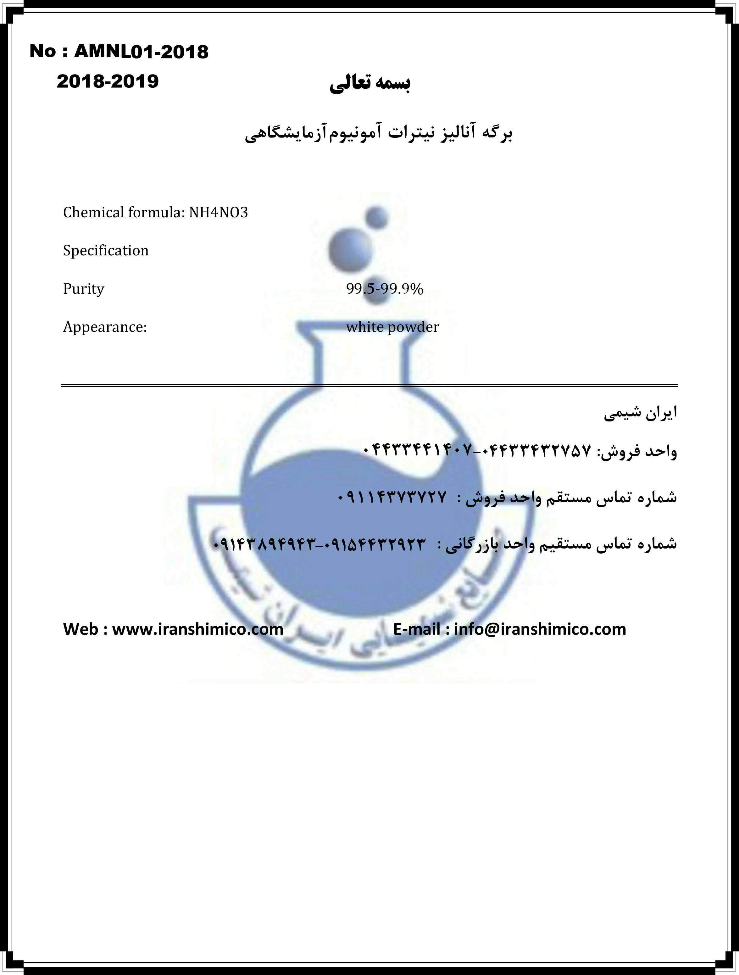این بخش مخصوص فروش نیترات آمونیوم آزمایشگاهی (Ammonium Nitrate) می باشد. در صورت نیاز به خرید ماده ی صنعتی آن به بخش فروش نیترات آمونیوم صنعتی مراجعه فرمایید.
