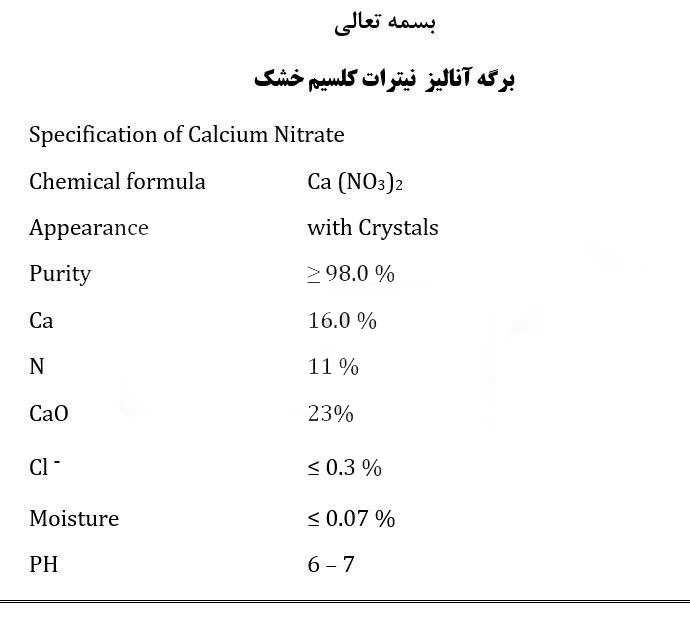 نیترات کلسیم صنعتی دارای آب تبلور و به شکل کریستالی بوده و از آن جهت که به طور کامل ( 100 درصد قابل حل شوندگی در آب ) در آب قابل حل می باشد برای مصارف کشاورزی بهترین نوع کود می باشد .